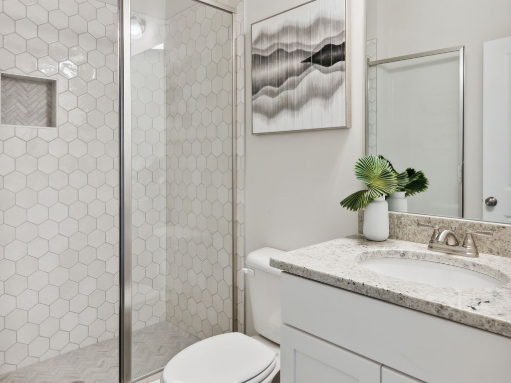 The owner’s suite is a luxurious escape, complete with crown molding, a ceiling fan, and a spa-inspired tile bathroom. Additional thoughtful upgrades include a mud bench near the entryway, cabinetry in the laundry room, flood lighting, custom blinds throughout, and a garage door opener with two remotes for added convenience.