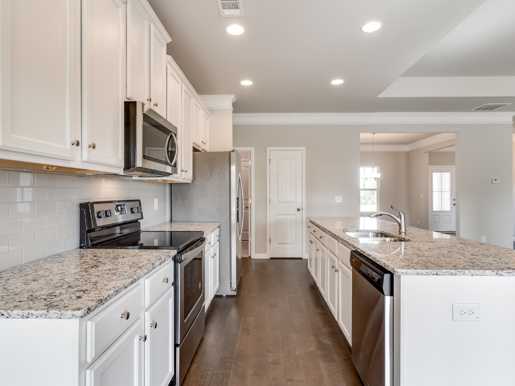 Designed with comfort and functionality in mind, this residence showcases luxury vinyl plank (LVP) flooring throughout the main living areas, creating a seamless and durable foundation. The gourmet kitchen is a true centerpiece, featuring granite countertops, stainless steel appliances, 42-inch upper cabinets, and ample workspace—perfect for both everyday living and entertaining guests.