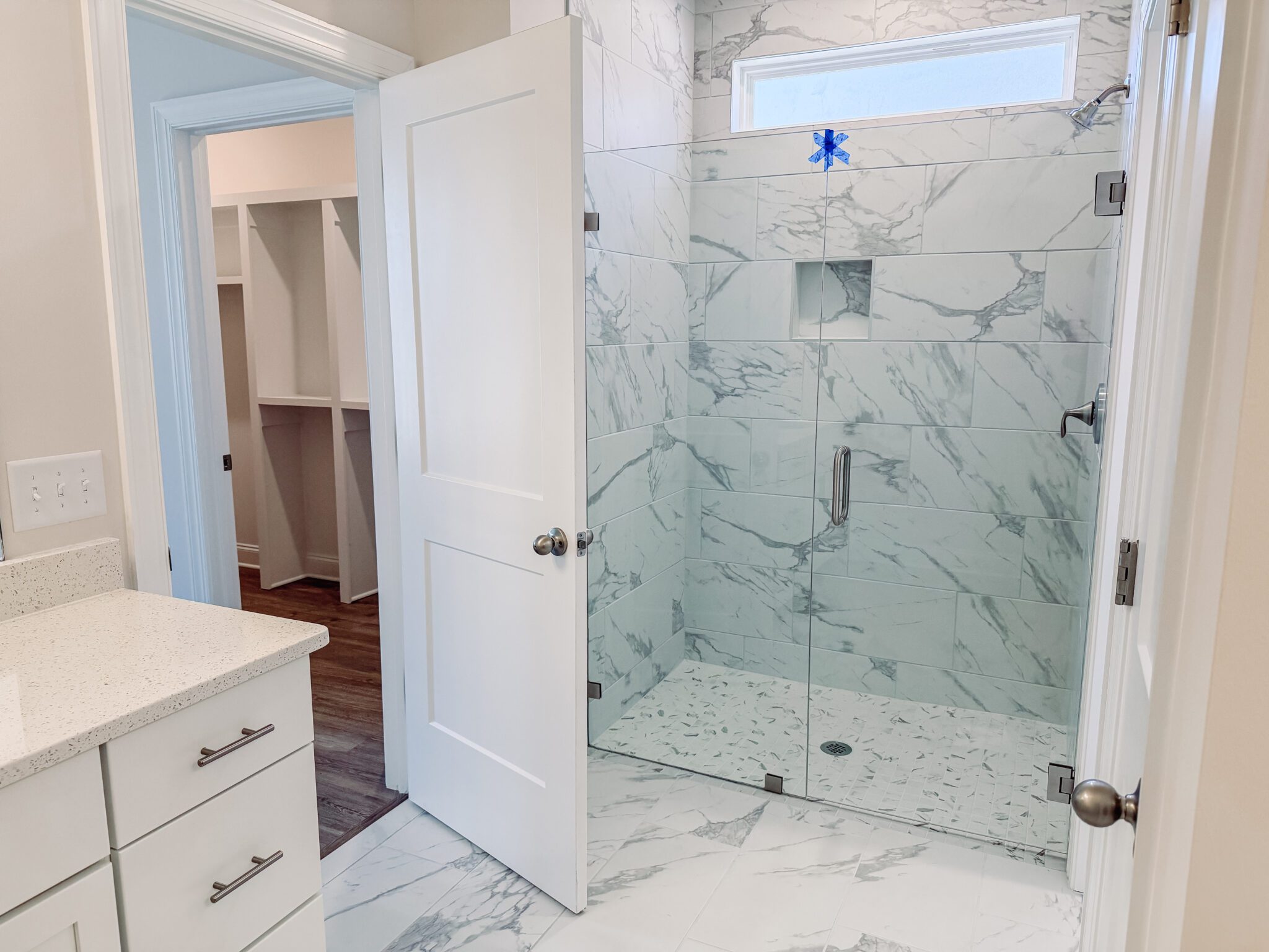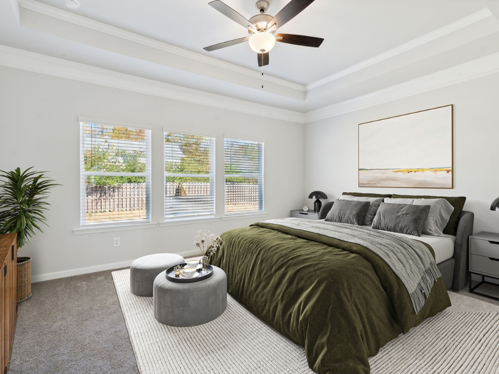 The owner’s suite is a true retreat with crown molding, a ceiling fan, and a beautifully appointed tile master bath. Additional highlights include a mud bench, laundry room cabinetry, flood lights, blinds throughout the entire home, and a garage door opener with two remotes.